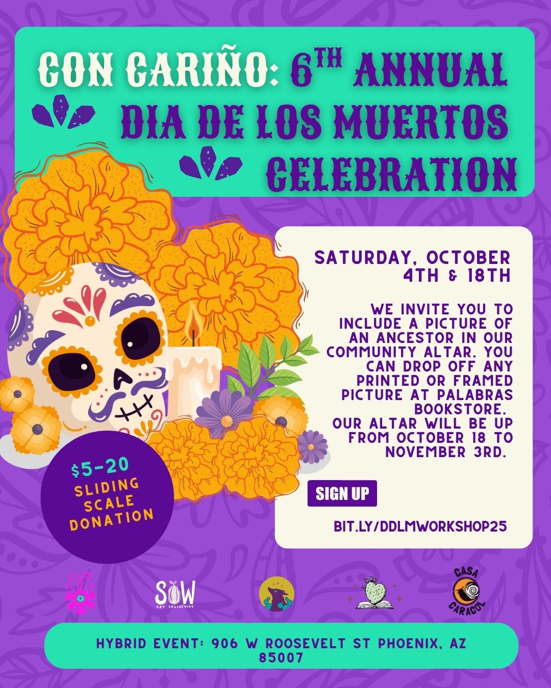 Casa Caracol (Palabras Bookstore) 906 W. Rosevelt St., PhoenixJoin us for our annual Día de Los Muertos workshops October 4th & 18th, 2025: October 4th: Crafts con Cariño (3-5PM) Papel picado workshop facilitated by SOW Arts Collective October 18th: DDLM Ancestor Altar workshop (11-1PM) HYBRID workshop! Workshop will be facilitated by La Lobita In person events: will take place at Casa Caracol, 906 W Roosevelt St, Phoenix, AZ 85015 Registration…